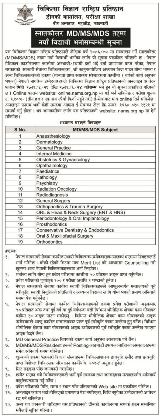 Admission Open for MD/MS/MDS 2076